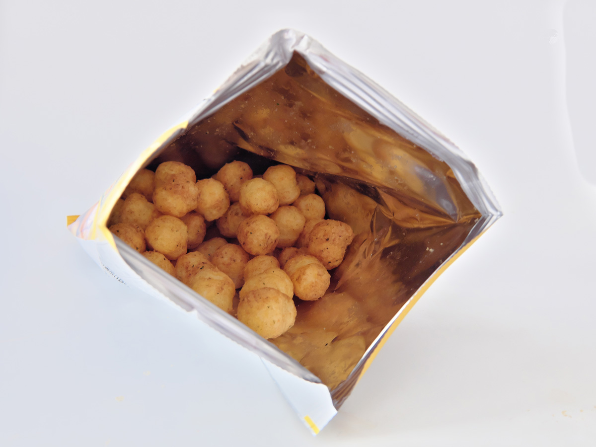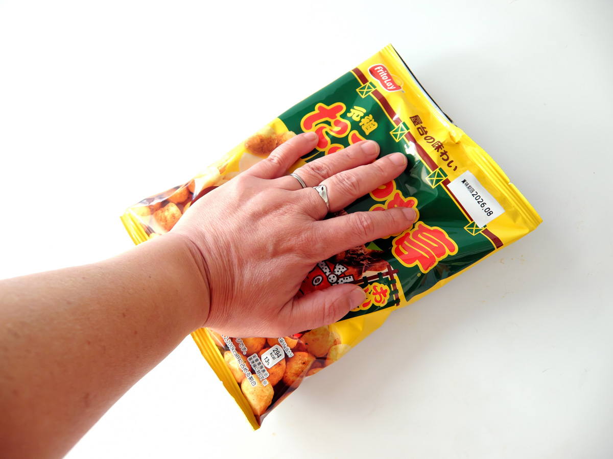 ↑袋の上からグイグイ手の平で押して、中のスナックをつぶす。