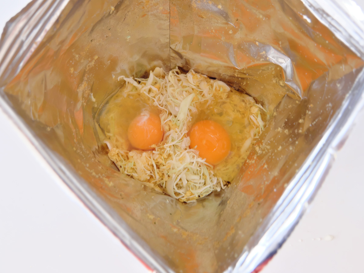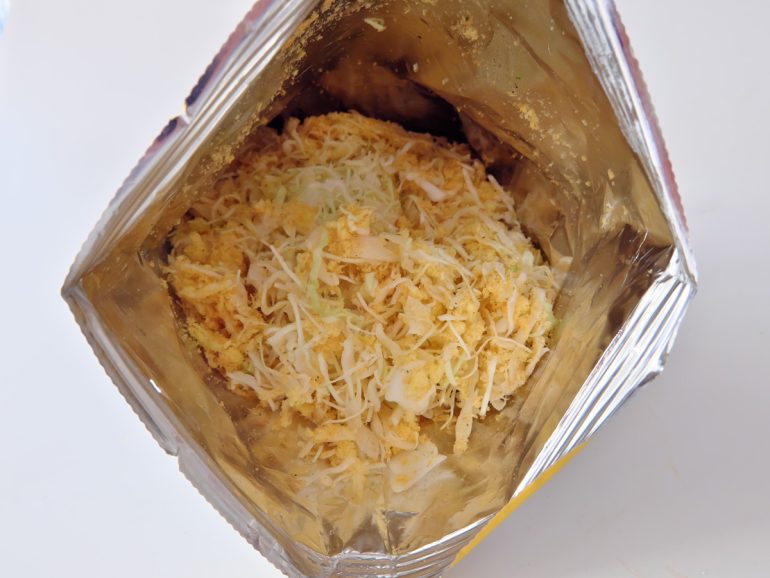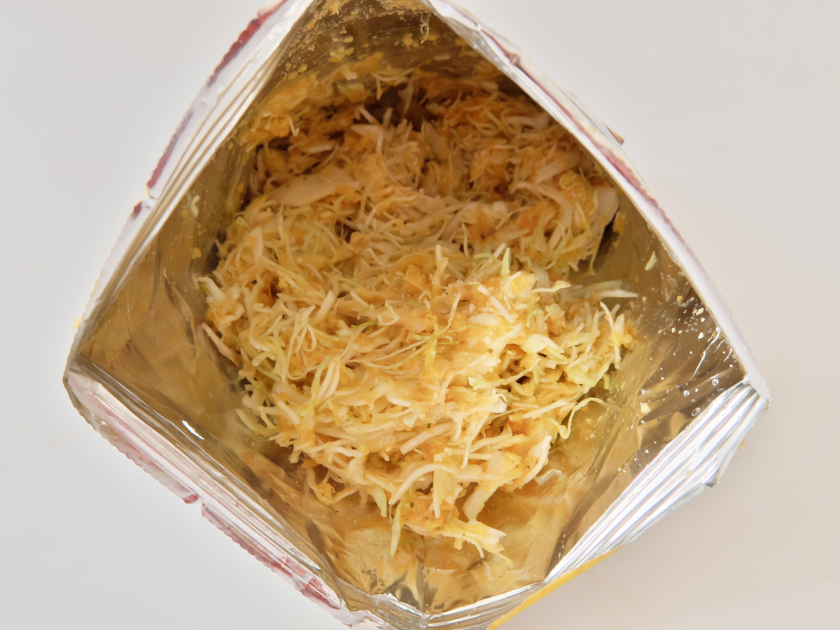 ↑袋の空いてる部分をグルグ巻いて閉じて上下を逆さにして振ったり、軽く袋の上から軽くもんだりして、砕けたスナックとキャベツを均等に混ぜる。