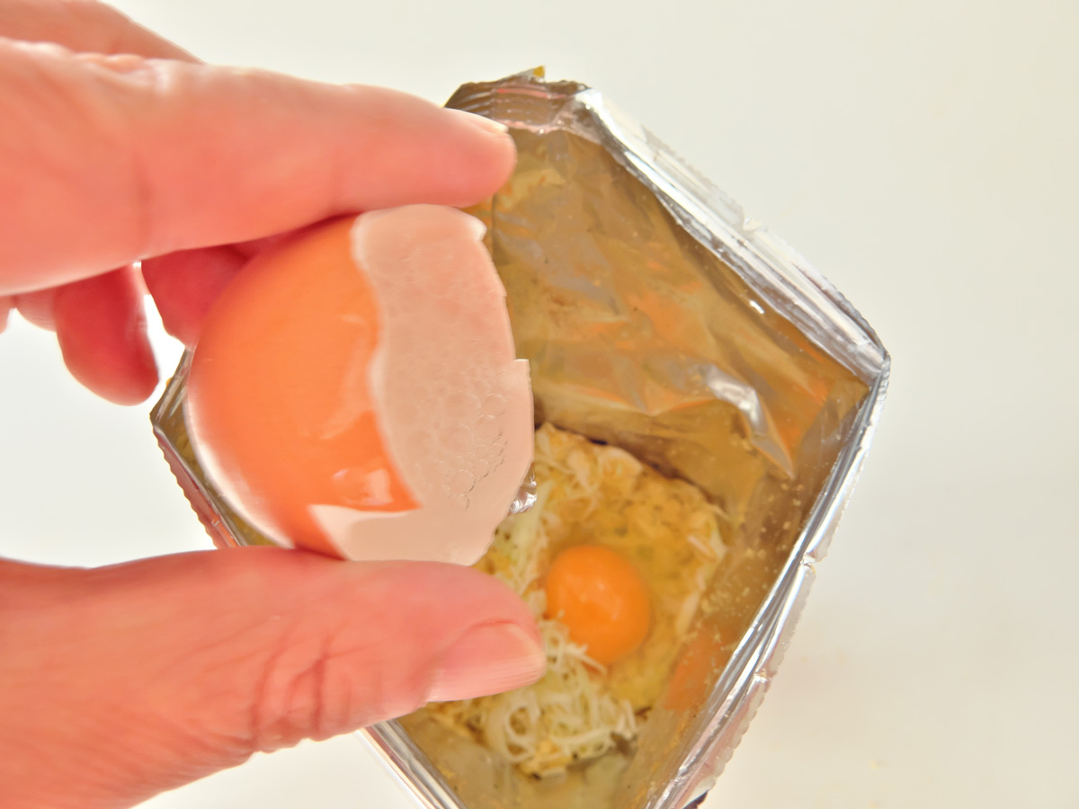↑水を卵1個分程入れる。さっき割った卵の殻で2杯入れると計量も簡単。