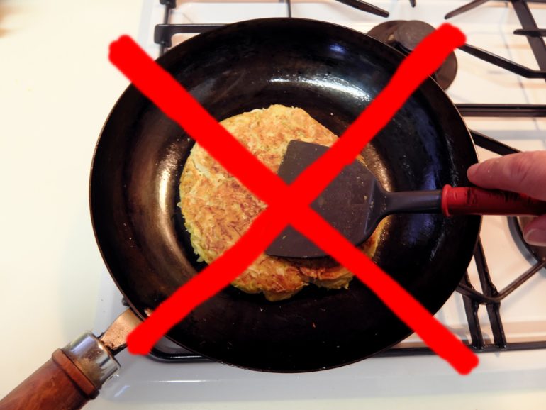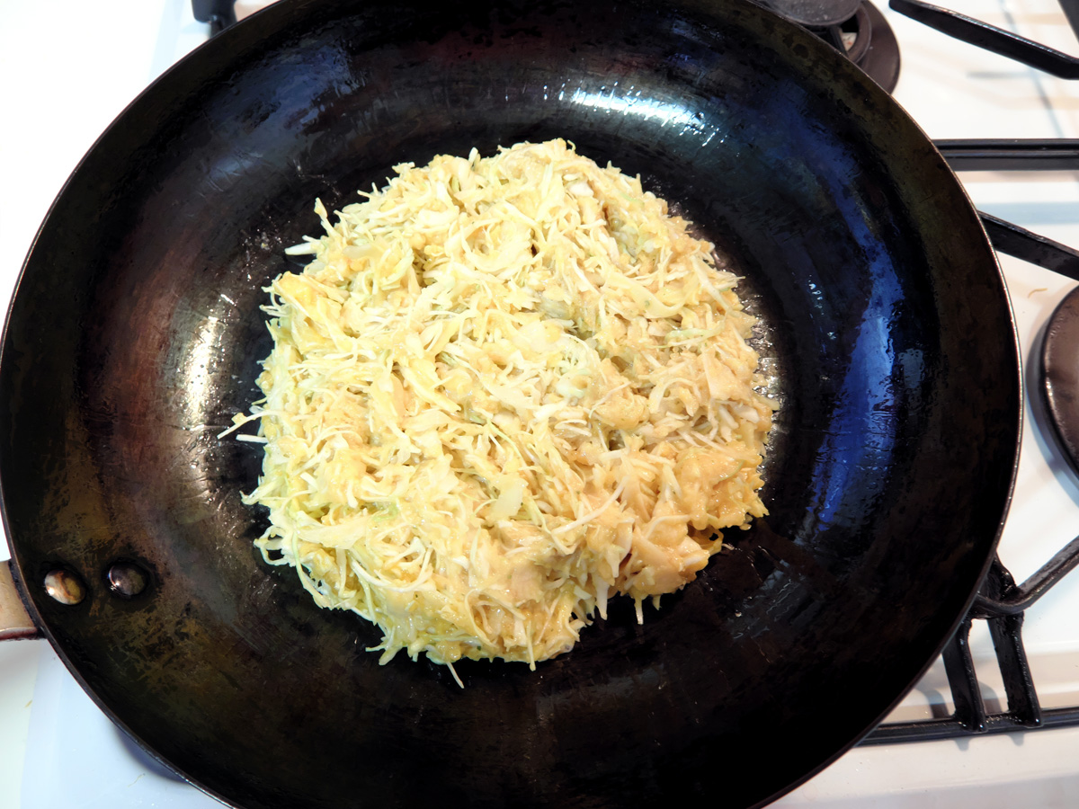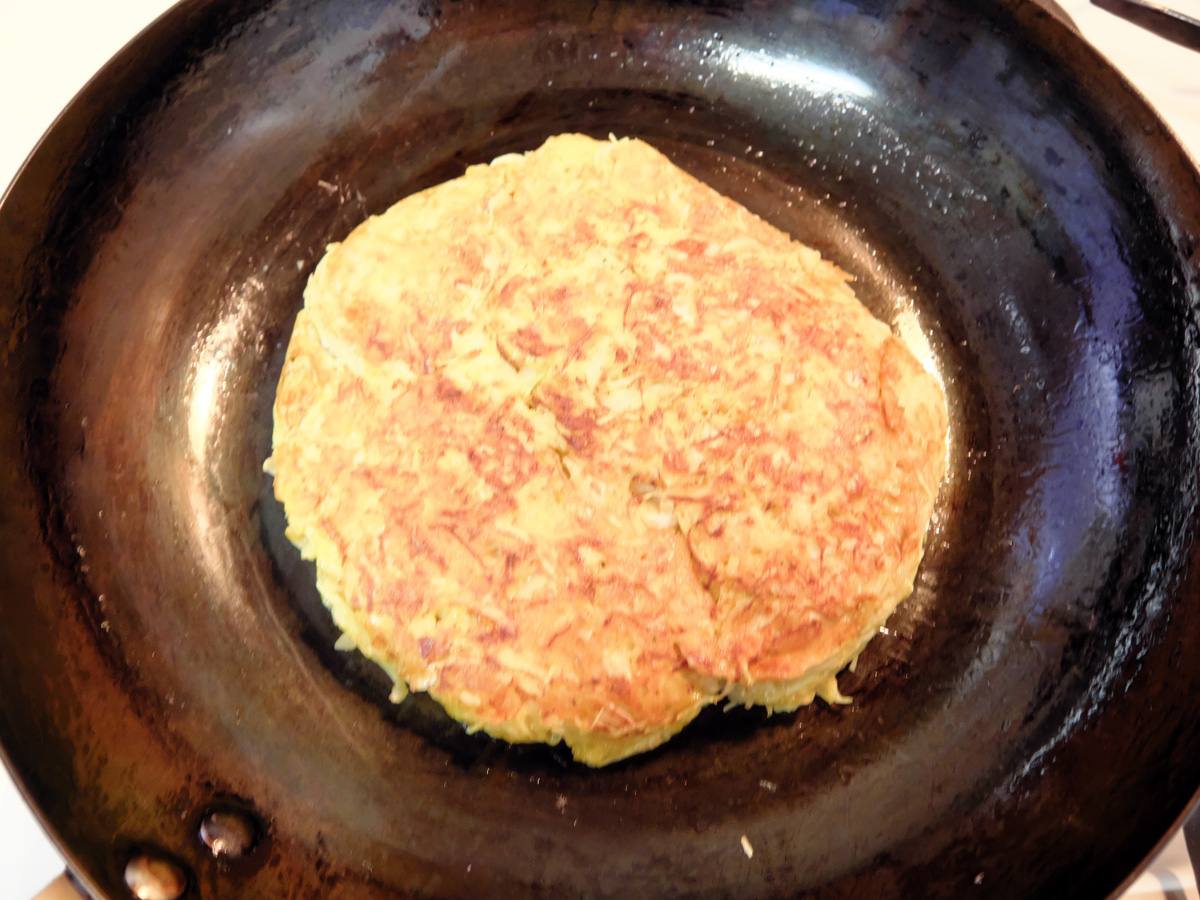 ↑焼いている面が薄くきつね色にく色付いたら(目安としては5~6分)、ひっくり返す。けっこう生地は柔らかいので、ひっくり返すのが難しいと思ったら、一度にフライパンに入れる生地の量は全体の半分にして、2枚に分けて焼くのもオススメ。