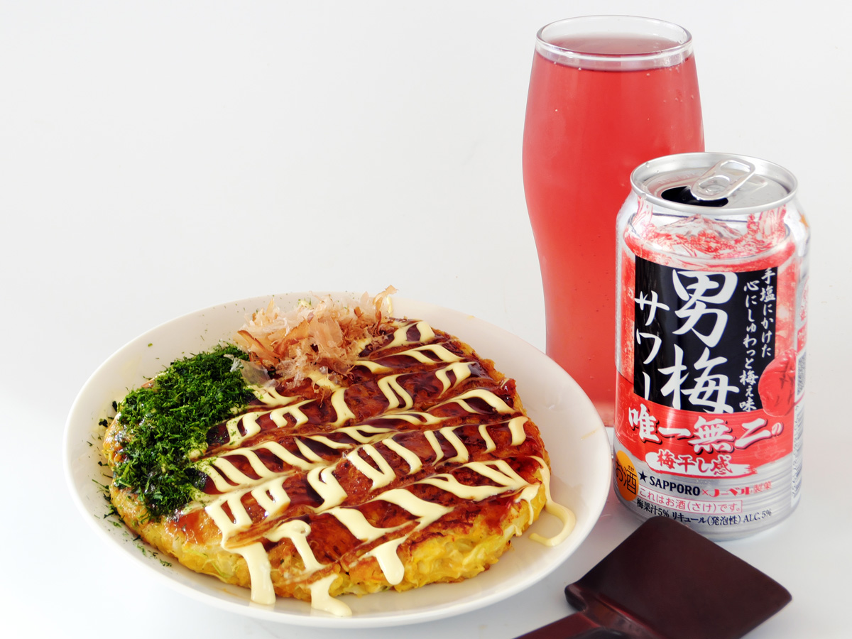 ↑とはいいましても、せっかくなんで皿に盛って、マヨネーズと青海苔と鰹節もコギレイに添えて『サッポロ 男梅サワー』とヤッてみましたァ!