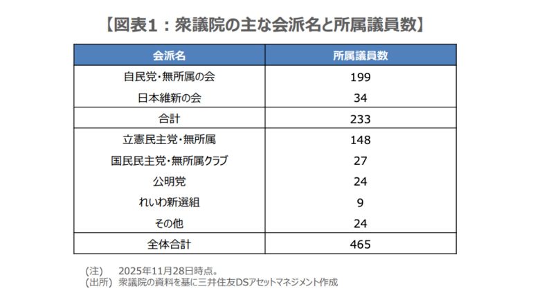 衆議院の主な会派と所属議員数をみると(図表1)、2025年11月28日に「改革の会」を組む無所属の国会議員3名が自民党の会派に合流したことで、自民党は199名となっており、日本維新の会の34名を合わせると与党は233名で、衆議院の過半数(233議席)に達している。