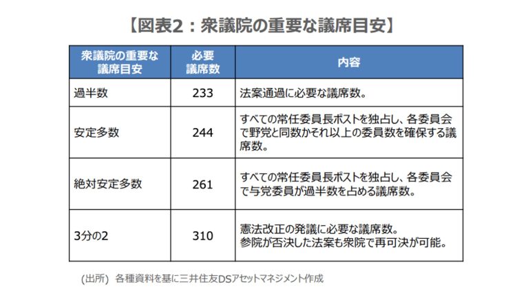 仮に解散総選挙となった場合、「安定多数(244議席)」、「絶対安定多数(261議席)」、「3分の2(310議席)」が議席数の目安になる(図表2)。