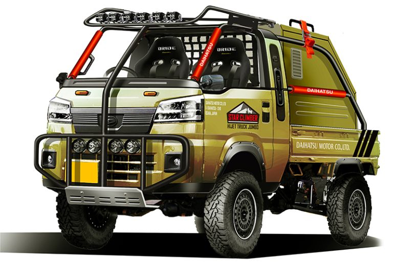 「軽トラ対決」のためダイハツがプロデュースしたカスタマイズカー。「ハイゼット トラック ジャンボ」の駆動力、登坂力を向上させ荷箱を追加することで、仕事から趣味、災害支援でも活躍できるモデル。