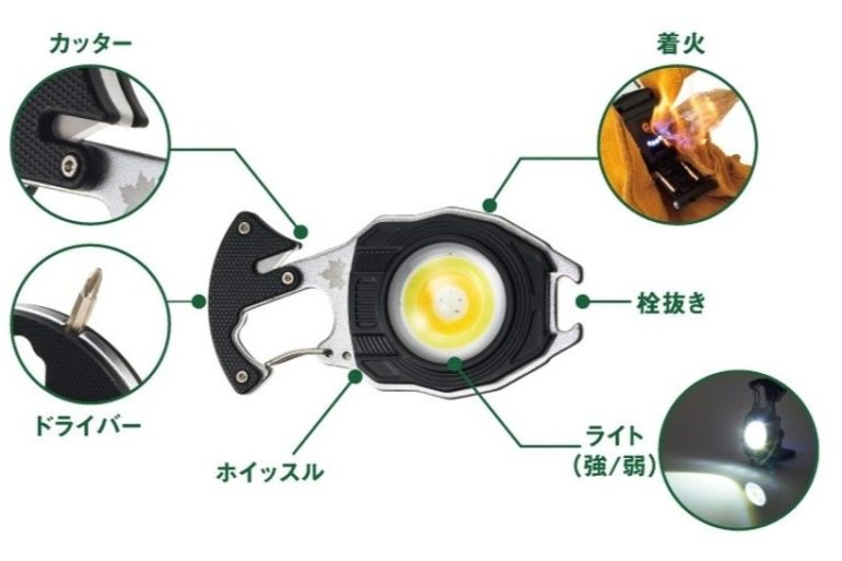 機能:ライト、火おこし、ドライバー、シートベルトカッター、栓抜き、ホイッスル