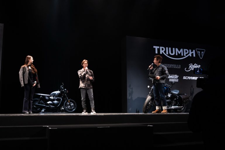 新型「モダンクラシックシリーズ」の国内初披露とともに、ダレノガレ明美さんのバイクに対する深いこだわりや、トライアンフの魅力、さらに実業家・モデルとしてバイクファッションへのこだわりや女性ライダーに向けたメッセージを紹介するトークセッションが行なわれた。