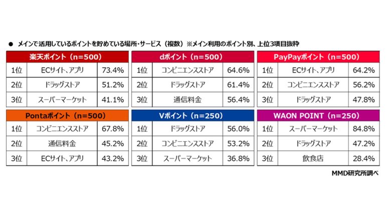 予備調査から抽出したポイント経済圏メイン利用者2500人を対象に、メインで活用しているポイントを貯めている場所・サービスと使っている場所・サービスについて聞いたところ(複数回答可)、楽天ポイント(n=500)とPayPayポイント(n=500)は「ECサイト、アプリ」、dポイント(n=500)とPontaポイント(n=500)は「コンビニエンスストア」、Vポイント(n=250)は「ドラッグストア」、WAON POINT(n=250)は「スーパーマーケット」となった。