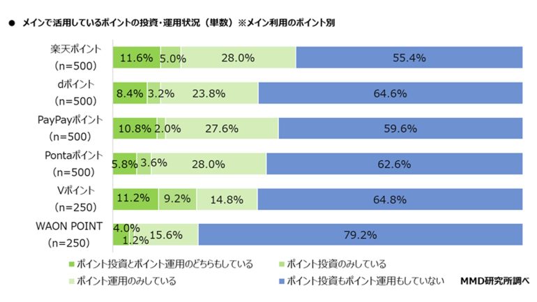 ポイント経済圏メイン利用者2,500人を対象に、メインで活用しているポイントでポイント投資やポイント運用をしているか聞いたところ、「ポイント投資とポイント運用のどちらもしている」「ポイント投資のみしている」「ポイント運用のみしている」を合わせてポイント投資・運用をしている割合が高いのは楽天ポイント(n=500)で44.6%、次いでPayPayポイント(n=500)が40.4%、Pontaポイント(n=500)が37.4%だった。