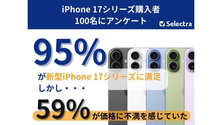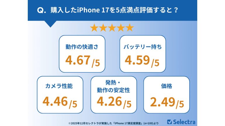 フランス発のウェブマーケティング企業であるセレクトラ・ジャパンでは、iPhone 17シリーズを購入した男女100名を対象に、iPhone 17シリーズにおけるスペックおよび価格に関する満足度調査を実施。結果をグラフにまとめて発表した。