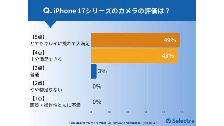 iPhone 17シリーズのカメラ性能は、「とてもキレイに撮れて大満足(5点)」という回答が49%、「十分満足できる(4点)」が48%、「普通」が3%という評価となった。
