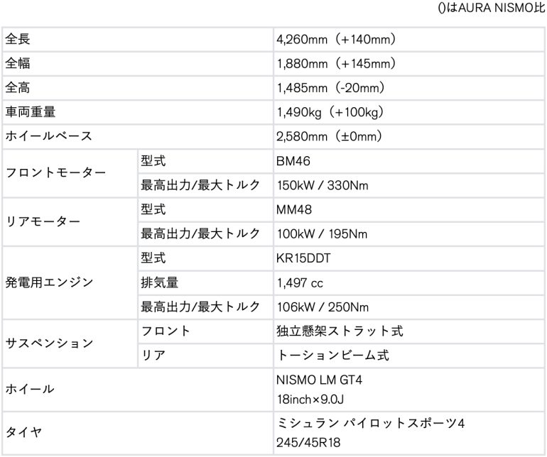 この「オーラNISMO RSコンセプト」は、量産のコンポーネントを活用しながら、レース参戦を見据えた技術検証を目的として、走る、曲がる、止まるといったすべての性能向上を目指して開発された。軽量コンパクトな「オーラNISMO」のボディに、ハイパワーな「エクストレイルNISMO」のパワートレインを搭載し、走りの性能を大幅に向上させている。