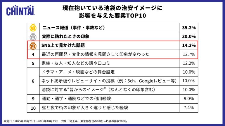 CHINTAIはこのほど、東京都と埼玉県に在住の男女900名を対象に、「池袋の治安イメージと再開発による意識変化」に関する調査を実施し、その結果を発表した。