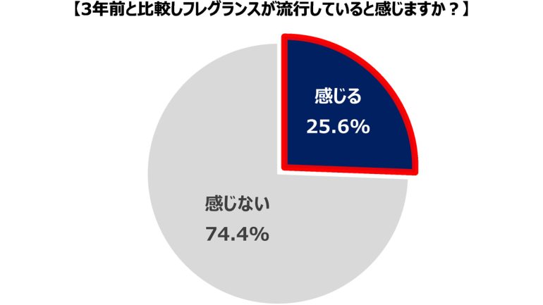 「3年前と比較してフレグランスが流行していると感じますか」という質問をしたところ、約4人に1人の25.6%の人が「感じる」と回答した。感じたことがある人のうち、「身の周りでフレグランスを使う人が増えた」が最も多い理由となった。