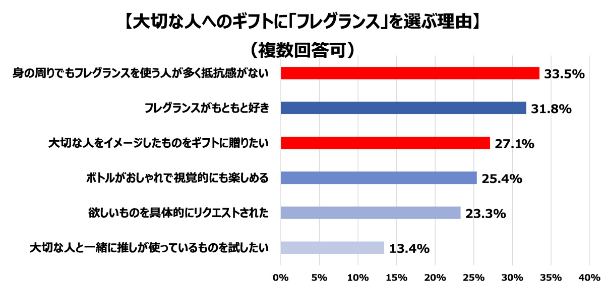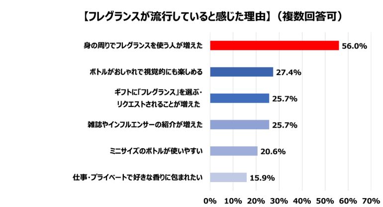 主な理由は回答数最多の「身だしなみや美容の一環として」のほか、ここでも「身の周りでもフレグランスを使う人が多く抵抗感がない」との回答が見られた。また、回答数の上位6項目には、「推しが使っているものを試してみたい」という声も見られ、昨今の推し活ブームがフレグランスにも到来している兆しが見え始めている。