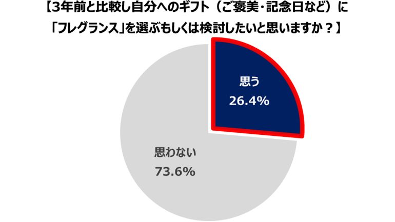 「3年前と比較して自分へのギフト(ご褒美・記念日)に『フレグランス』を選ぶもしくは検討したいと思いますか」という質問をしたところ、4人に1人の26.4%が「はい」と回答した。