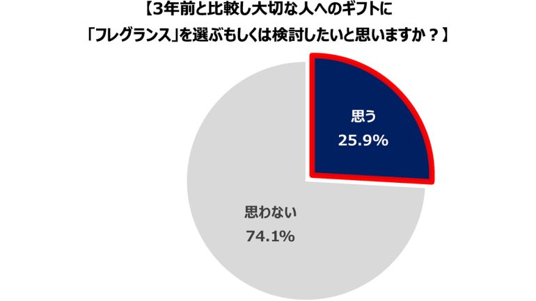 「3年前と比較し大切な人へのギフトに『フレグランス』を選ぶもしくは検討したいと思いますか」という質問をしたところ、4人に1人の25.9%が「はい」と回答した。「身の周りでもフレグランスを使う人が多く抵抗感がない」が理由として最多だったほか、「大切な人をイメージしたものをギフトに贈りたい」も多数の回答を占めた。フレグランスを使用する人が増えたという実感が、大切な人への香りを贈る後押しになっていると推察できる。