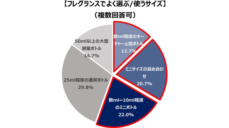 上記3回答それぞれを合計すると64.5%と、フレグランスにおける「ミニ化」需要が進行していることがわかる。前述の結果も踏まえると香りへのハードルが下がっていることに加え、ブランド側もミニサイズの展開が増え、生活者側も少量から様々な香りを試しやすくなっていることが相乗効果となっていると推察できる。