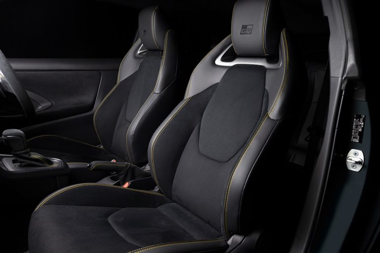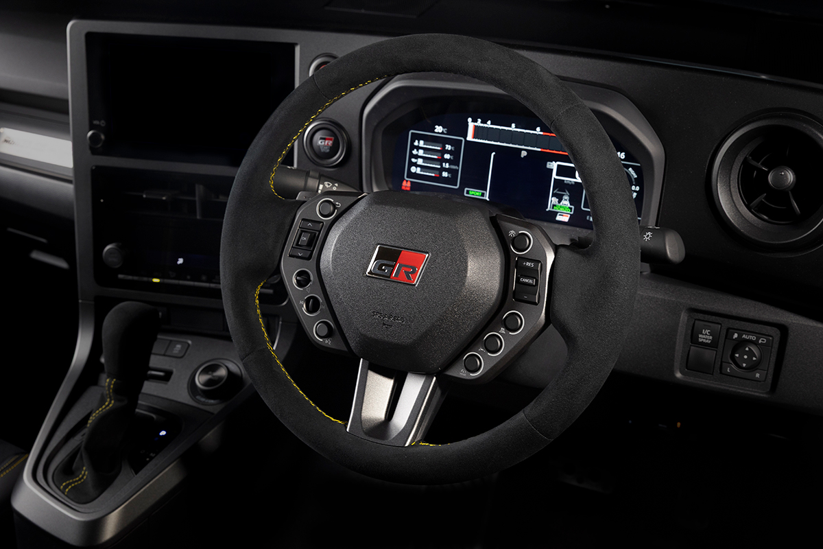 ブレーキキャリパーのほか、インテリアのステッチはモリゾウのシグネチャーカラーであるイエローとなっている。スエード表皮を使ったステアリングホイールも専用装備となる。ステアリングホイールは、モータースポーツにおける操作性を追求し、外径をひとまわり小径化するとともに、パドルシフトやステアリングスイッチの形状を変えている。ステアリングスイッチはGRヤリスRally2からの学びを得て、各種スイッチが独立した形状となった。加えてインテリアには、MORIZO RRロゴを施した専用シリアルナンバープレートが装着されている。