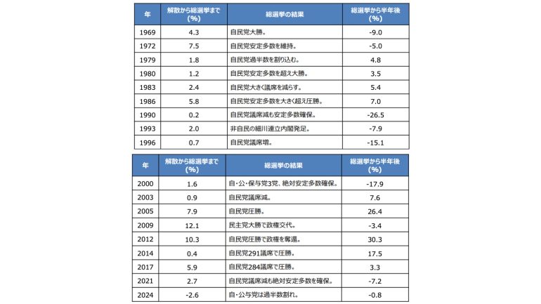 【図表:衆議院解散・総選挙と日経平均株価の騰落率】