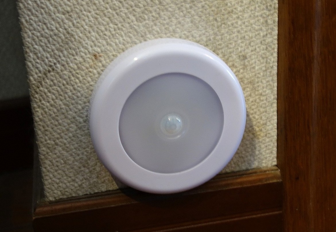 わが家では6か所に設置しているが、設置方法にはコツがある。まずは位置決めだ。これは日中と夜に確認したい。日中でも薄暗くなる場所は避けたほうがよく、また、ペットが頻繁に往来する場所も避けたほうがいいだろう。日中でもセンサーが反応して無駄に点灯し、ペットが頻繁に通ると電池の消耗が激しくなるからだ。そして、玄関に入ったとき、部屋から廊下を経てトイレ・・・など、停電時に足元がおぼつかなくなる動線上の適切な位置をしっかり確認し、仮止めして点灯を確認してから決めることが重要だ。仮止めを推奨する理由は、購入した人感センサーフットライトは、鉄板プレート裏の粘着テープが強力で、一度貼り付けると剥がすのが大変だからである(とくに木材に貼り付ける場合。ザラザラした壁紙なら剥がすのは比較的容易)。