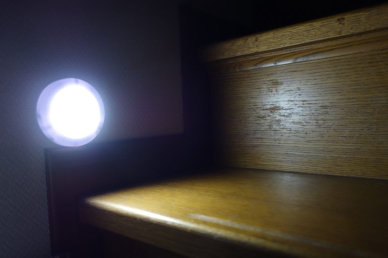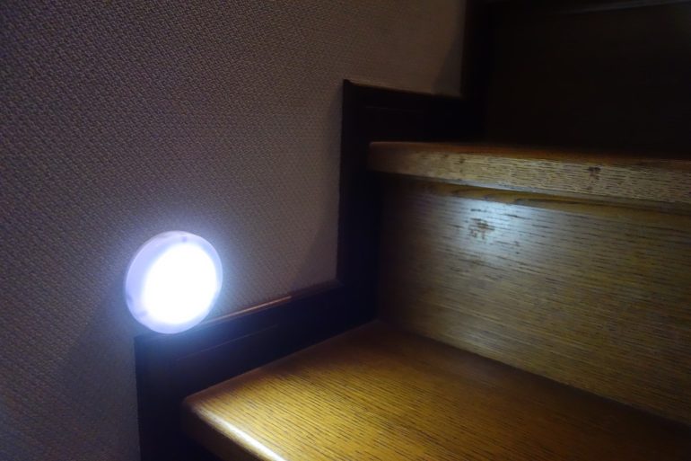 電池式の人感センサー式フットライトを玄関、廊下、階段などに取り付けてみて1か月たち、まだ停電を経験していないものの、日常的にも、夜、寝室から廊下を経てトイレに行く、夜、外から真っ暗な玄関に入り、照明をつけるまでの時間・・・といった場面で人感センサー式フットライトは大活躍。夜、寝室から廊下を経てトイレに行く際も、わざわざ壁のスイッチを押し、廊下の天井照明を点灯する必要がなくなり、電気代の節約にもなりそうなのである。
