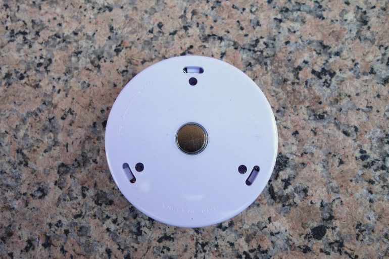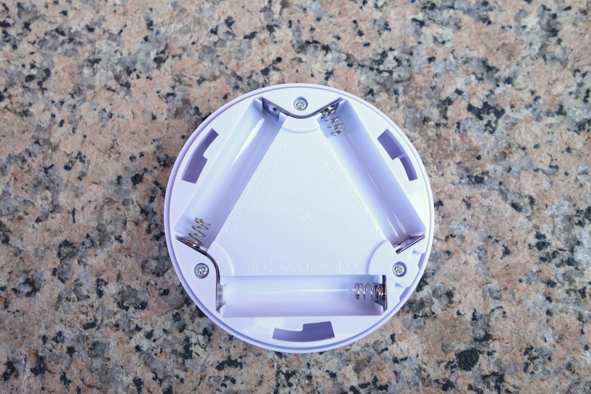 これは便利!!と感じたことは、人感センサーフットライトが、壁に貼り付けた鉄板と磁石だけで固定されている点だ。つまり、本体を外すのはわけなく、単体で持ち歩け、状況によってどこかに仮移設することも可能であり、壁に固定されているわけではないので、本体背面から行う電池交換も楽々(裏蓋を回すだけで開く)ということだった。