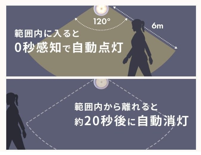加えて、この人感センサーフットライトの場合、センサーの範囲はセンサーから左右120度、約6m(実際には設置環境によってそうとも言えなさそうだが、家庭内の使用の反応としては十分)。したがって、真横からは反応しないため、壁下に取り付ける際、動線との見極め、点灯確認が必要。仮止めして実際に歩いてみて、どう反応するかをチェックしてから本設置するようにしたい。