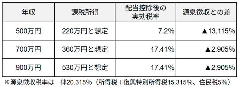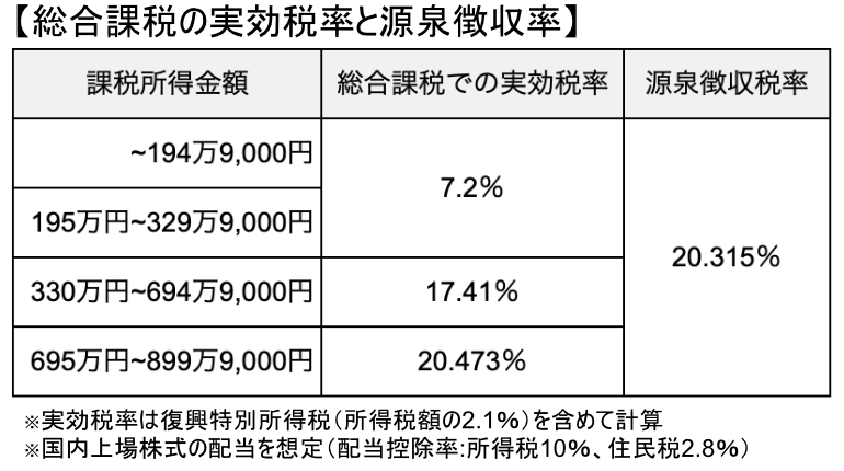 ここでは、所得税率と配当控除率の関係から、復興特別所得税や住民税を含めた実効税率を算出し、配当金支払時に源泉徴収される税率20.315%と比較することで、大まかな有利・不利の目安を明らかにします。