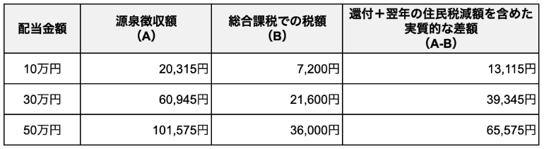 配当金額ごとの還付額は、以下のとおりです。