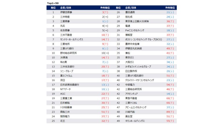 本調査開始以来、初めて「伊藤忠商事」が総合1位を獲得した。以下、2位「三井物産」、3位「三菱商事」、4位「丸紅」、5位「住友商事」、6位「三井不動産」、7位「サントリーホールディングス」、8位「三菱地所」、9位「三菱UFJ銀行」、10位「野村総合研究所」「JR東海」と続いた。