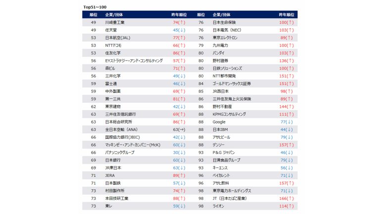 ランキング上位には、不動産の三井不動産(6位)、食品のサントリーホールディングス(7位)、銀行の三菱UFJ銀行(9位)、コンサル・シンクタンクの野村総合研究所(10位)、運輸のJR東海(10位)、電子・電気機器のソニーグループ(14位)、輸送用機器のトヨタ自動車(21位)、電力の関西電力(24位)、損害保険の東京海上日動火災保険(28位)、広告の電通(29位)など、50業界中18業界のNo.1企業がTOP30位以内に名を連ねている。
