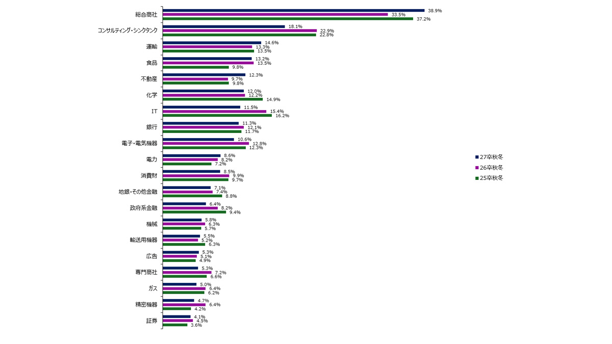 一方で、かつて上位を独占したコンサルティング業界の得票シェアは25卒22.8%→26卒22.9%→27卒18.1%で推移。高止まりの状態から低下へ転じた。アクセンチュア(14位→42位)、PwCコンサルティング(18位→29位)、デロイト トーマツ コンサルティング(23位→40位)、ボストン コンサルティング グループ(27位→32位)、アビームコンサルティング(37位→47位)、マッキンゼー・アンド・カンパニー(60位→66位)。