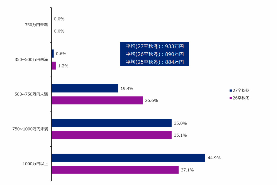 30歳時の平均希望年収は933万円。前年890万円、前々年度884万円から大幅増で、過去最高水準となった。