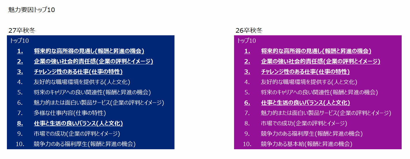 学生が企業を選ぶ際に重視する項目について、1位「将来的な高所得の見通し」2位「企業の強い社会的責任感」3位「チャレンジ性のある仕事」は順位に変化なし。一方で「ワークライフバランス」が昨年6位から8位へ後退した。
