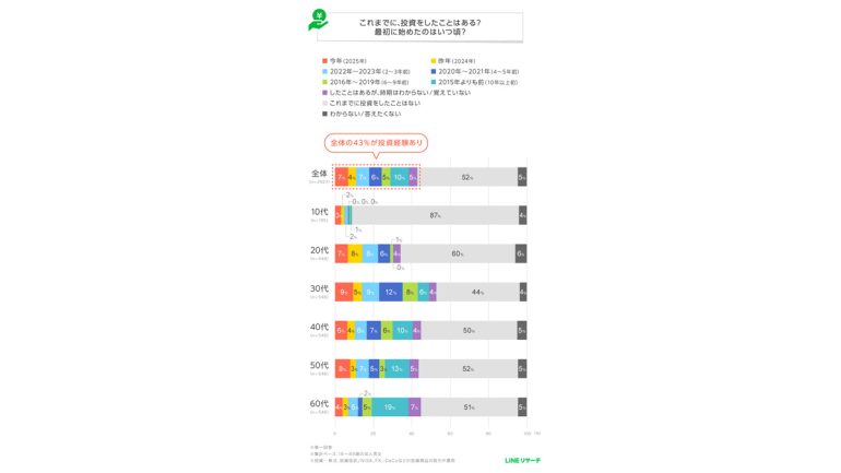 「LINEリサーチ」では、全国の15~69歳の男女を対象に、投資経験や投資を始めた時期、今後の投資意向に関する調査をしたので、結果を紹介しよう。