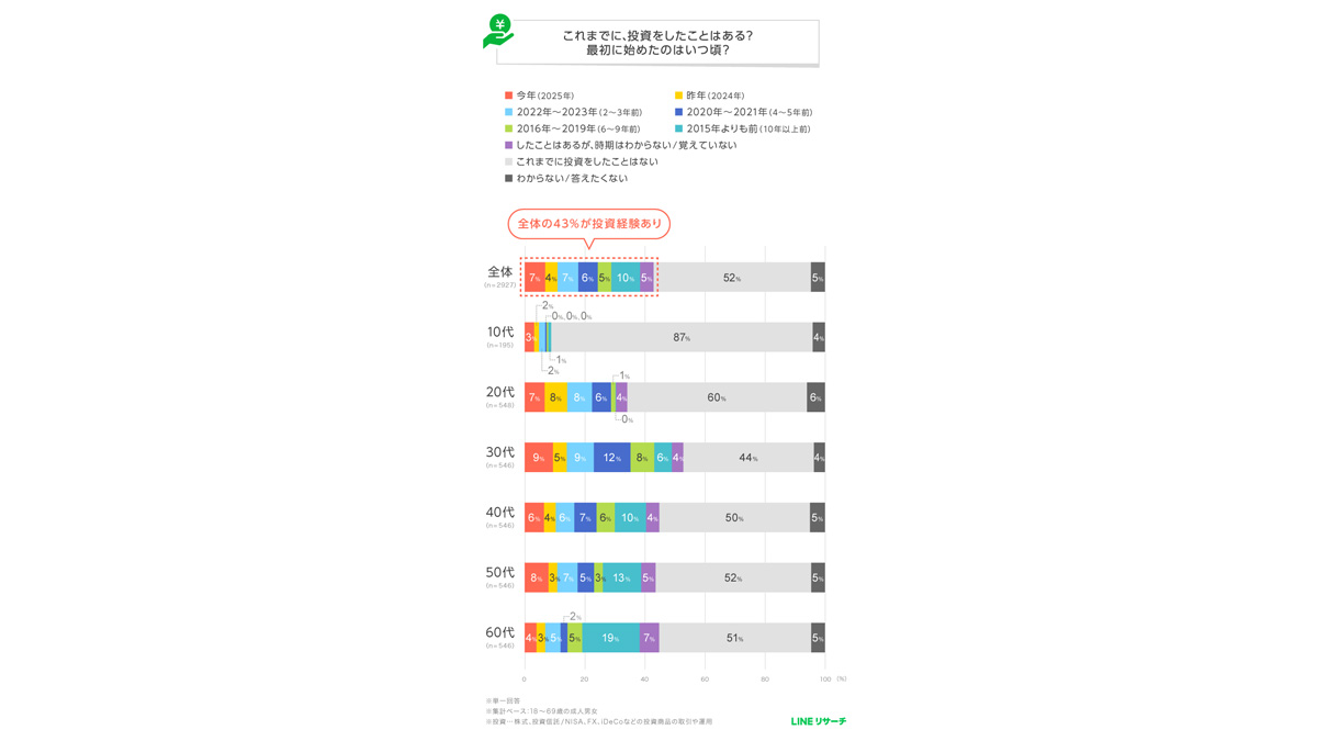 まず18歳以上の成人男女に、これまでの投資経験や最初に投資を始めた時期を聞いた。(2025年12月調査時点)
