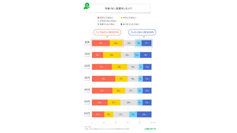 一方で、「あまりしたくない」「まったくしたくない」を合わせた[したくない]の合計は2割台半ばに留まり、多くの人は投資に対して前向きな考えを持っている様子がうかがえる。