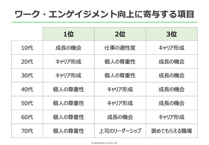 年代別の結果で特徴的だったのは、70代を除くすべての世代で「自分が成長している」「キャリアに意味を見出せる」が上位に挙がっていた点だ。ただし、具体的に求める内容は年代によって異なる。若い世代では挑戦できる環境や成長の実感、ミドル世代では自身の経験を活かす機会や将来を考えるための支援、シニア世代では自分の考え方や働き方を尊重する風土が求められている。