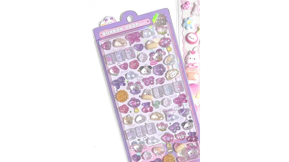 「ボンボンドロップシールは2024年春に登場した比較的新しいシールで「令和のシール」と言える存在です。(※ちなみにこれはジャンル名ではなく商品名)ぷっくりしたシールは昔からありましたが、デコパーツのような立体感とドロップキャンディのような透明感を兼ね備えたものは新鮮な印象です」