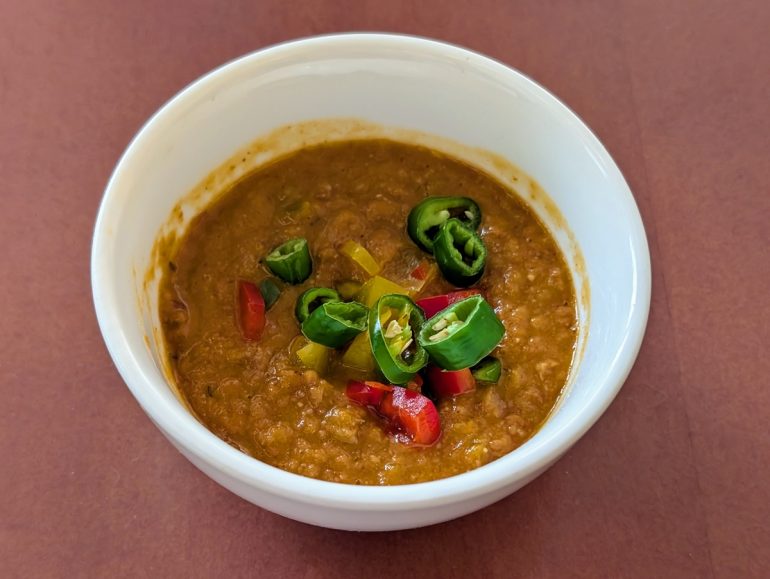 個人的には、まずは「そのまま」、次に「唐辛子のスライスとレモン汁」を加えて「さわやかなピリ辛」味で、その後「みじん切りにしたタマネギ、パプリカ、トマト」も加えてアクセントをつけるのがオススメだ。