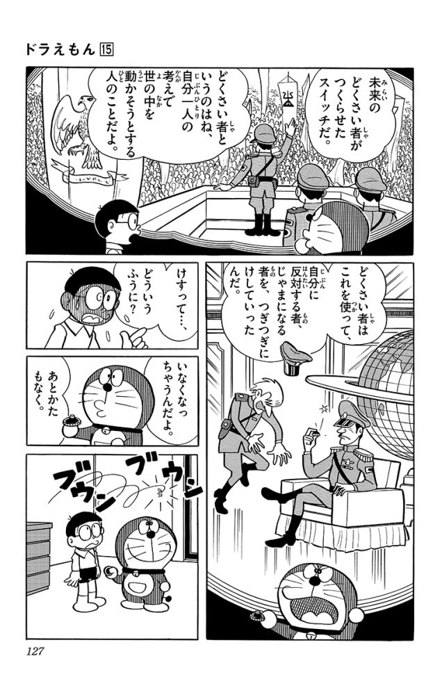 ――『どくさいスイッチ』で消された人間や生物は、最初からこの世に存在していなかったことになります。未来の独裁者が開発させた道具ですが、実際には『独裁者を懲らしめる為の道具』です。