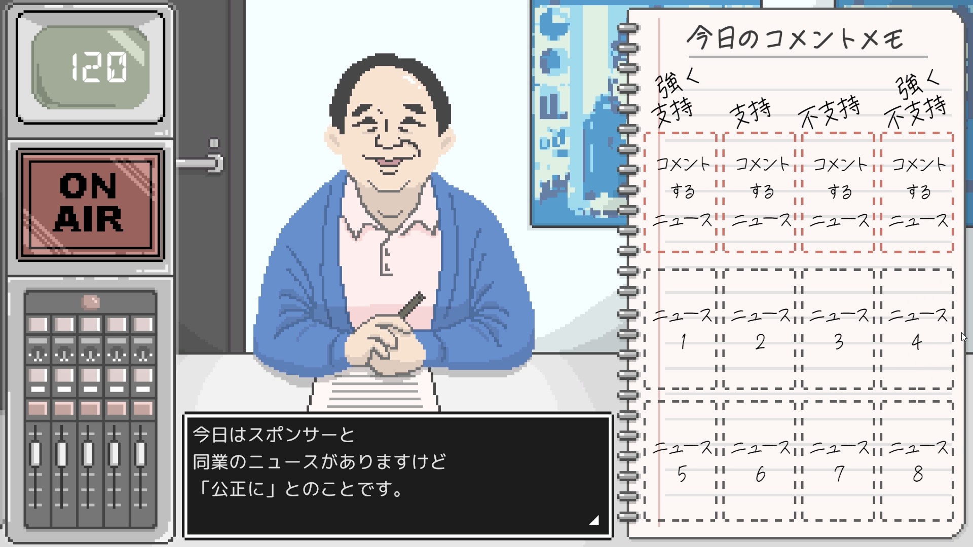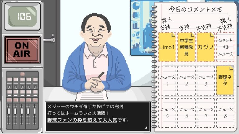 去年暮れに実施されたプレイテスト、そしてそれ以前の試遊版やゲームイベントでの展示プレイなどでも筆者は『コメンテーター』に触れている。「英知の結晶」とは、まさにこのような作品のことを言うのではないか。筆者もライターという稼業に足を踏み入れて10余年経つが、日本型ジャーナリズムをここまで的確に表現している作品も珍しい。