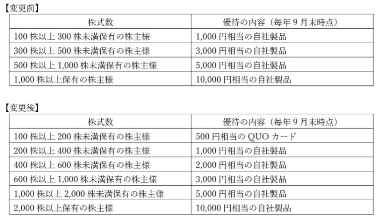 分割後の100株では、500円相当のQUOカードがもらえる。分割前100株は200株になり、1,000円相当の自社商品がもらえ、変更はないが、分割後400株も新設。こちらは2,000円相当の自社商品がもらえる。