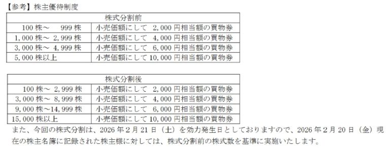 つまり、分割前水準で考えると25株保有していた人も株式分割により100株になり、2026年3月は株主優待が受け取れるようになった。