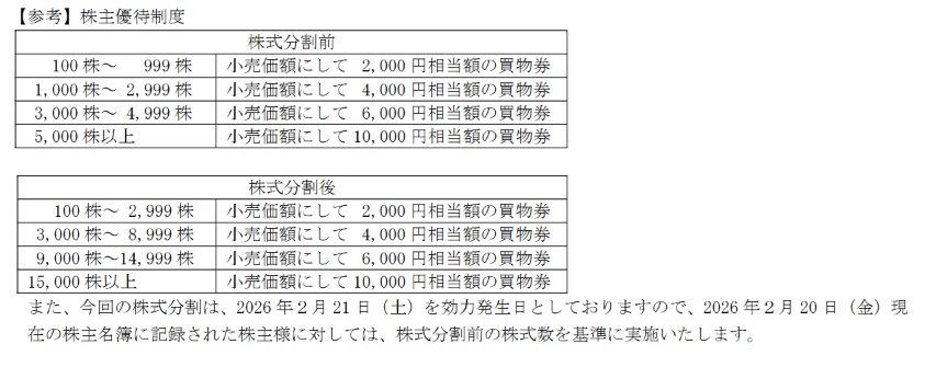 しまむらでは2026年2月20日を基準日とする1:3の株式分割を控えている。そして、分割後100株保有で2,000円分の買物券が受け取れる。