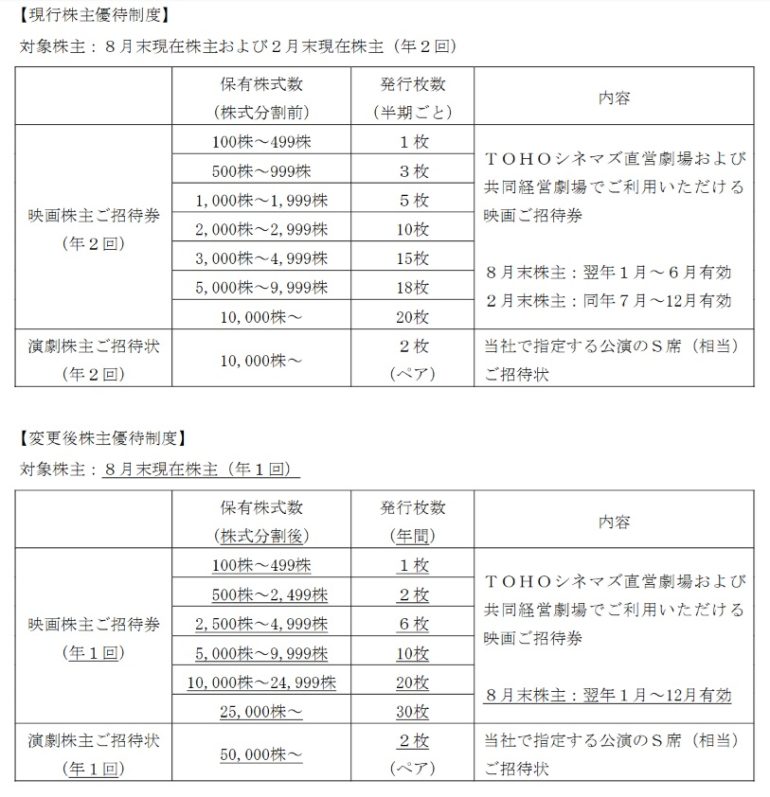 映画興行を行う東宝は、2026年1月14日に、2月末の1:5の株式分割を発表し、分割後の100株でも株主優待を受け取れると発表した。ただし、東宝の株主優待は、これまで年2回(2月8月)だったが、2027年からは2月の株主優待がなくなり年1回(権利月8月)となる。