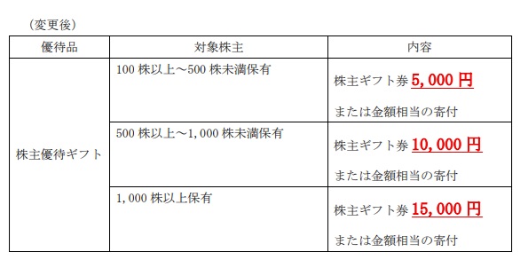 前回、2025年の100株(分割後500株)では、提示すると購入価格から5%割引になる株主優待カードと、株主ギフト券2,500円分(あるいは金額相当の商品)がもらえていた。2026年2月の権利では、5%割引になる株主優待カードは廃止、その代わり株主ギフト券が1万円分(あるいは金額相当の寄附)となる。