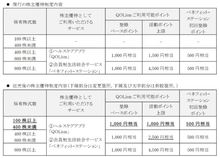 今回、株主優待の拡充発表があり「分割後100株でも株主優待」もらえる銘柄になったというわけだ。そして、400株では「QOLism(キュオリズム)」でもらえる活動ポイントの上限が2,500円相当に拡充。ただし、800株の場合は株主優待の拡充はない。株数によって活動ポイント上限が決められているが、株主優待で歩数記録などの健康管理ができるのが画期的だ。