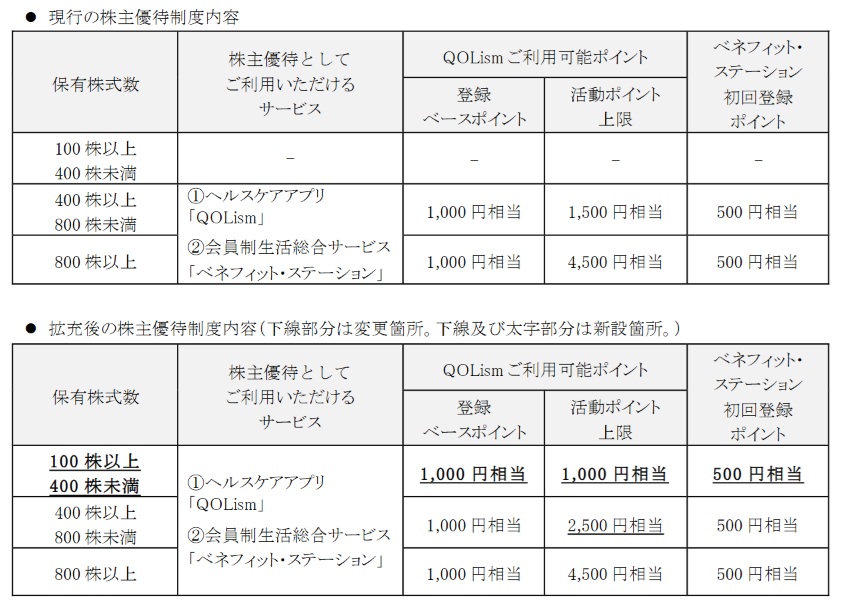 100株でもらえる株主優待は、ヘルスケアアプリ「QOLism(キュオリズム)」の登録可能ポイントで、ベースポイントが1,000円相当、活動ポイントは上限1,000円相当。また、ベネフィット・ステーション初回登録ポイントとして500円相当ももらえる。
