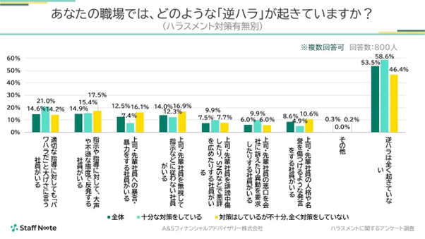 A&Sフィナンシャルアドバイザリーの『職場のハラスメントに関するアンケート調査』では、職場で起きている「逆パワハラ」についての1位は「指示や指導に対して大声や不遜な態度で反発する」(14.9%)、2位が「適切な指導に対しても『パワハラだ』と大げさに言う」(14.6%)という結果になった。